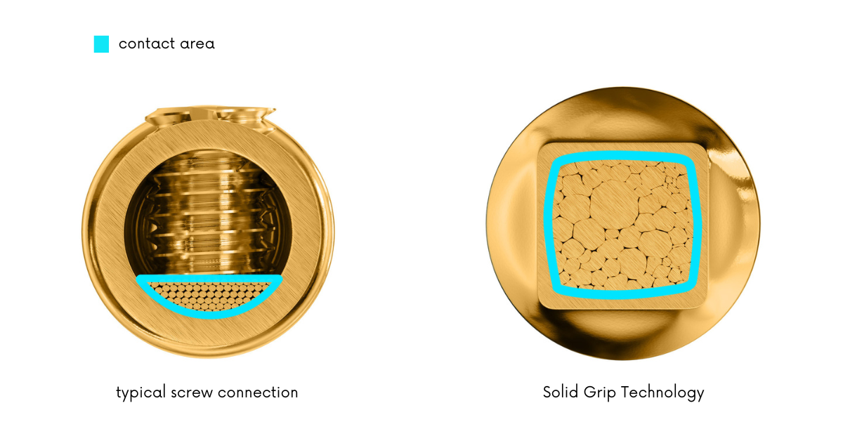 Solid Grip Technology, i.e. pressing instead of a screw clamp