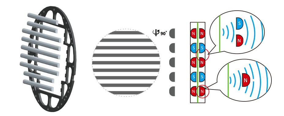 Zaawansowana konstrukcja magnesów, jako akustycznie transparentna, ma znaczący wpływ na zmniejszenie dyfrakcji fal, czyli ich rozproszenia, co pozwala zachować ich integralność i objawia się czystszym, dokładniejszym brzmieniem dźwięków i jeszcze wierniejszym budowaniem sceny dźwiękowej.