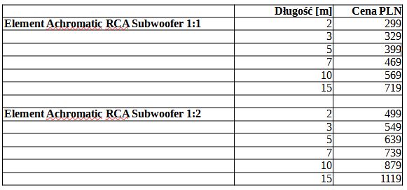 Kabel subwooferowy Element Achromatic RCA wykorzystuje ekranowaną, konstrukcję koaksjalną z jedną żyłą sygnałową wykonaną z miedzi OCC w przypadku wersji 1:1. Natomiast w odmianie 1:2 zastosowano czterordzeniową konstrukcję opartą tym razem o miedź typu OFC. Interkonekty zapewniającą doskonałą odporność na zakłócenia i szumy, dzięki czemu idealnie nadaje się do instalacji z wieloma źródłami i przy wykorzystaniu dłuższych kabli, które zwykle są wymagane przez optymalne rozmieszczenie subwooferów.