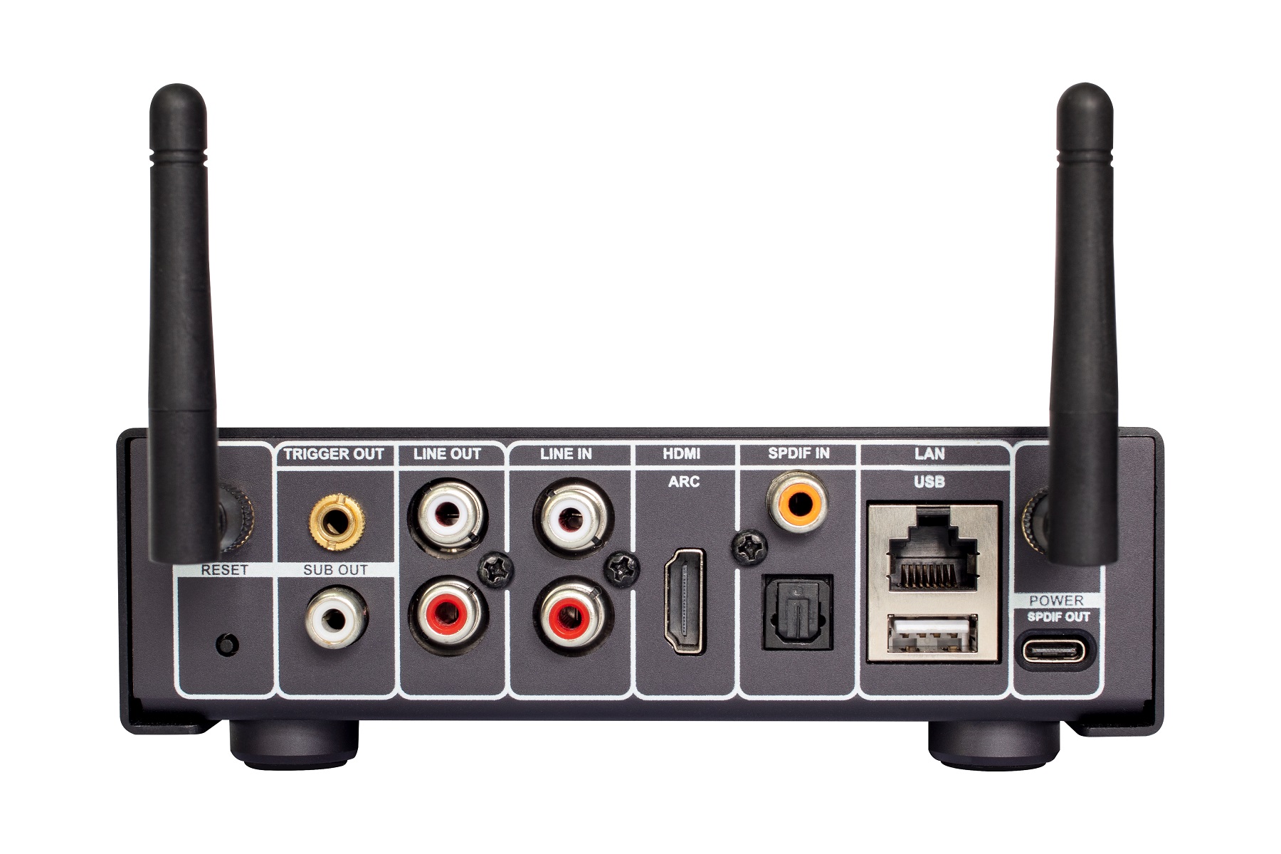 wyjścia: coaxial (USB-C), liniowe 2x RCA, słuchawkowe mini Jack 3.5mm, wyzwalacz 12V (Trigger)