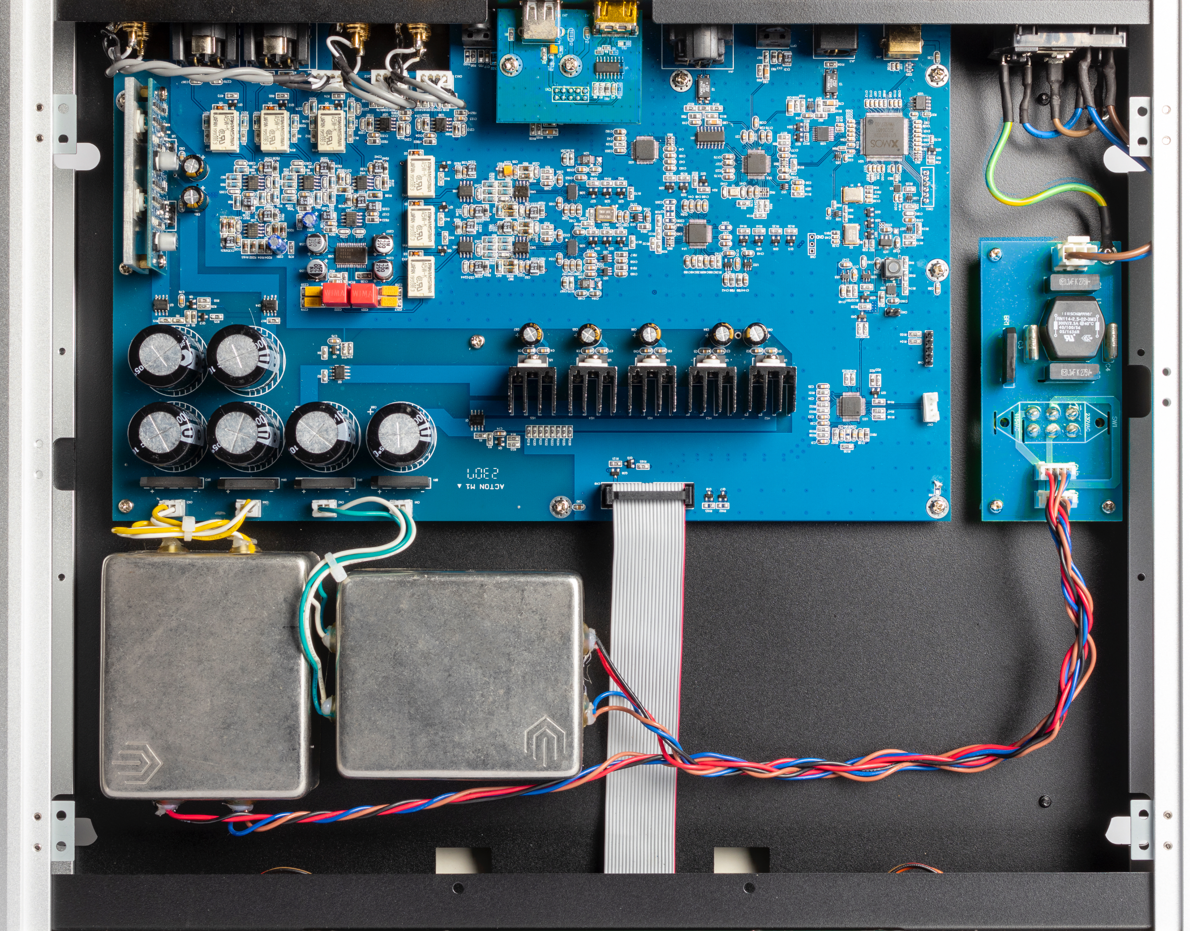 Filtr AC redukuje szum pojawiający się w wysokich częstotliwościach, następnie tak przefiltrowany prąd trafia do transformatorów C-Core. Transformatory typu C-Core z rdzeniem składanym charakteryzują się wyższą skutecznością niż klasyczne transformatory toroidalne. Wynika to z faktu, że charakteryzują się mniejszymi stratami energii w przepływie pola magnetycznego (mniejszą upływnością pola elektromagnetycznego), a więc wyższą sprawnością i stabilnością. Transformatory zamknięto w stalowych puszkach w celu zapewnienia lepszego ekranowania, minimalizując tym szum interferencyjny, który może zakłócać pracę innych obwodów. NuPrime Evolution DAC-2 dysponuje wielkim magazynem prądowym (około 60,000uF), na który składa się łącznie sześć kondensatorów elektrolitycznych, co zapewnia wręcz żelazną stabilność zasilania w najbardziej krytycznych momentach.