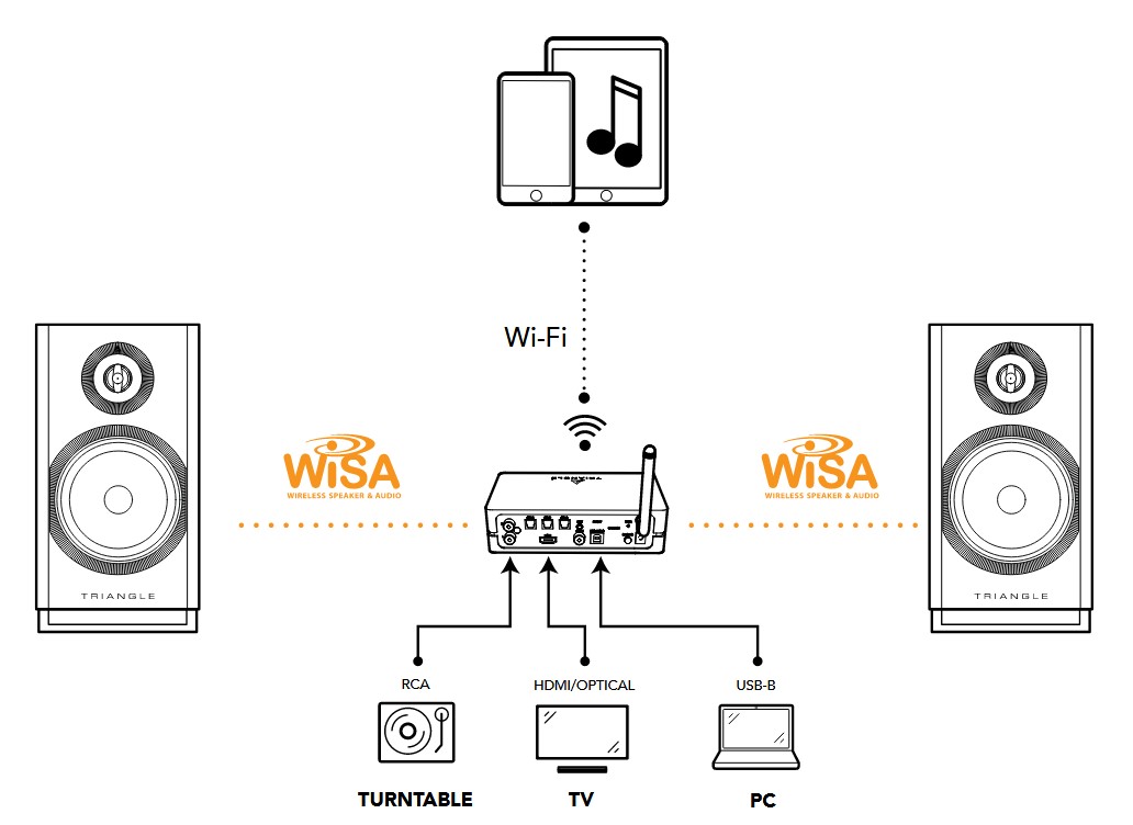 Dzięki technologii WiSA, Capella umożliwia połączenie bezprzewodowe bez opóźnień w sygnale (2,4 ms). System Capella składa się z 2 kolumn podstawkowych, które w pomieszczeniu można umieścić swobodnie, bez ograniczeń. Za pomocą WiSA, kolumny synchronizują się z kompaktowym hubem, który obsługuje wszystkie analogowe i cyfrowe wejścia audio (Wi-Fi, HDMI, USB, RCA, optyczne itp.).