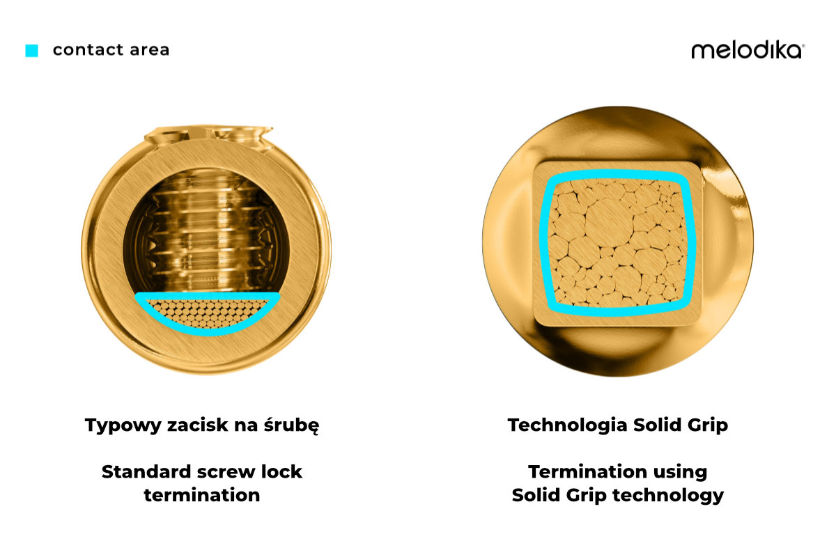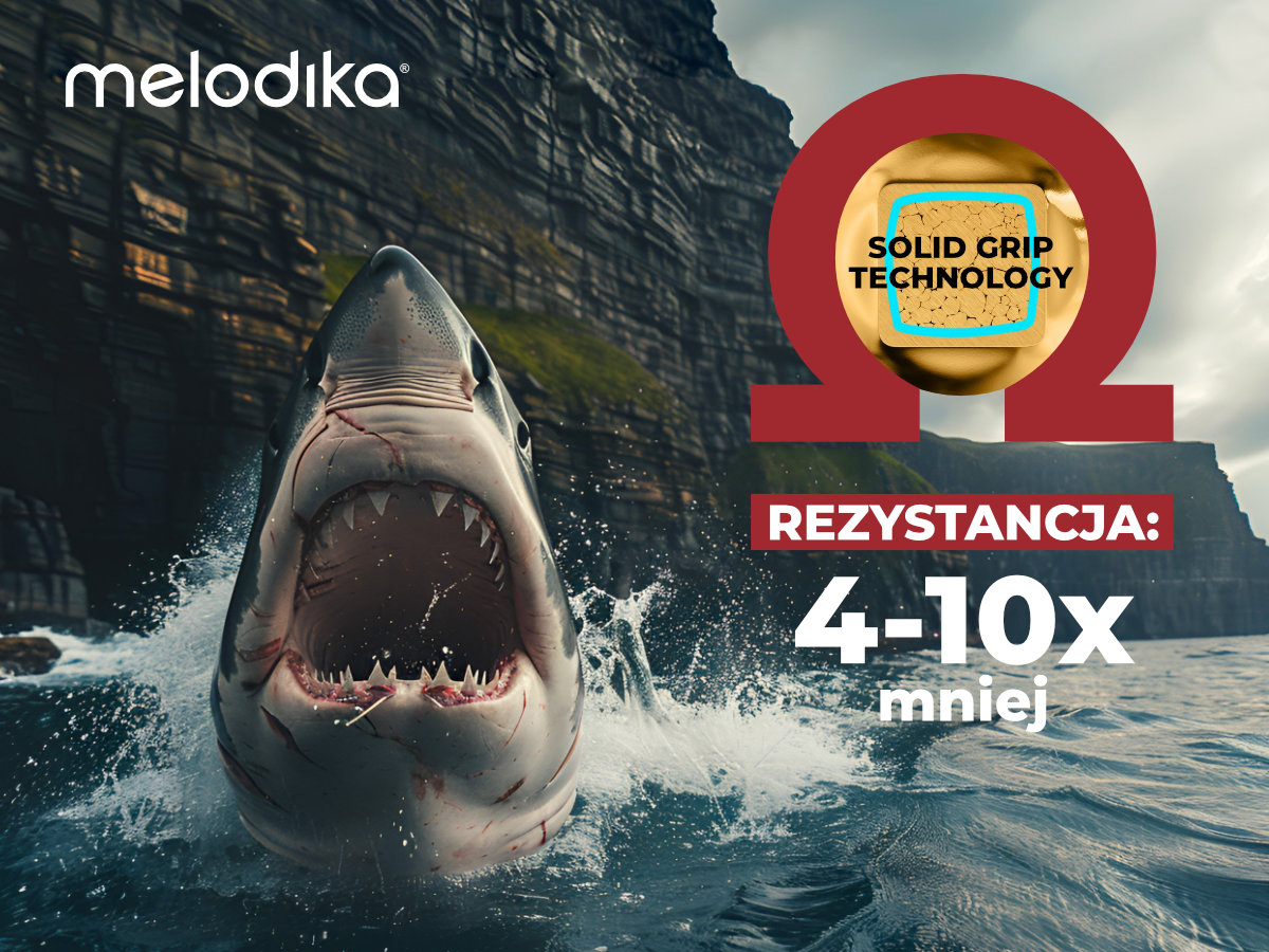 Siła nacisku szczęk żarłacza białego to prawie 2 tony/cm. Teraz z taką samą siłą zaciskane są połączenia wtyków kabli marki Melodika. Solid Grip to technologia szczelnego łączenia wtyków z przewodem głośnikowym bez użycia lutowania. W przeciwieństwie do standardowego połączenia z użyciem zacisków śrubowych, Solid Grip polega na zaciśnięciu odpowiednio przygotowanego wtyku na przewodzie głośnikowym za pomocą prasy, która oddziałuje z siłą ca 2000 kg na 1 cm kw. Pozwala to na szczelne sprasowanie wszystkich żył razem z wtykiem w sposób, który eliminuje wolne przestrzenie pomiędzy nimi i maksymalizuje powierzchnię styku. Taka technologia zapewnia niezawodne, trwałe połączenie, które jest odporne na utlenianie i oferuje znakomitą przewodność elektryczną o zmniejszonym oporze.