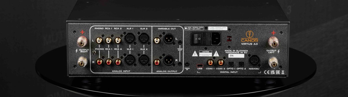 Canor Virtus A3 to hybrydowy wzmacniacz All-In-One Dual Mono klasy A/AB z pełnym zestawem wejść cyfrowych i analogowych, zawierający wzmacniacz mocy, przedwzmacniacz gramofonowy, wzmacniacz słuchawkowy i przetwornik cyfrowo-analogowy w jednym urządzeniu.